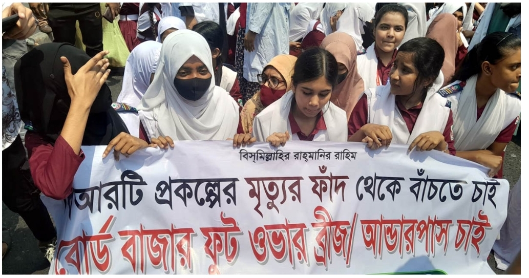 ঢাকা-ময়মনসিংহ মহাসড়কের অসমাপ্ত বাস র্যাপিড ট্রানজিট (বিআরটি) প্রকল্পের কারণে দীর্ঘদিনের ভোগান্তি নিরসন এবং সড়ক দুর্ঘটনায় হতাহতের প্রতিবাদে গাজীপুরের বোর্ড বাজার এলাকায় মানববন্ধন ও মহাসড়ক অবরোধ করেছেন এলাকাবাসী।